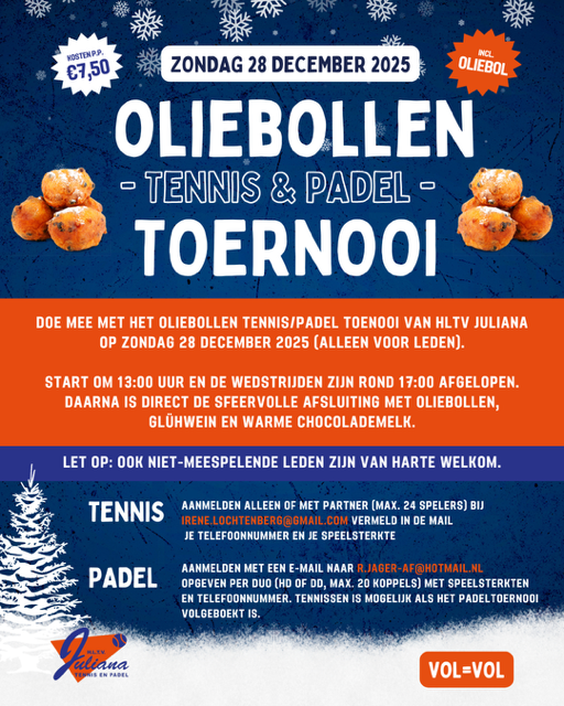 Decembermaand, oliebollenmaand…. Schrijf je in voor het Juliana Oliebollentoernooi op 28 december 2025. Zie bijgaande flyer.