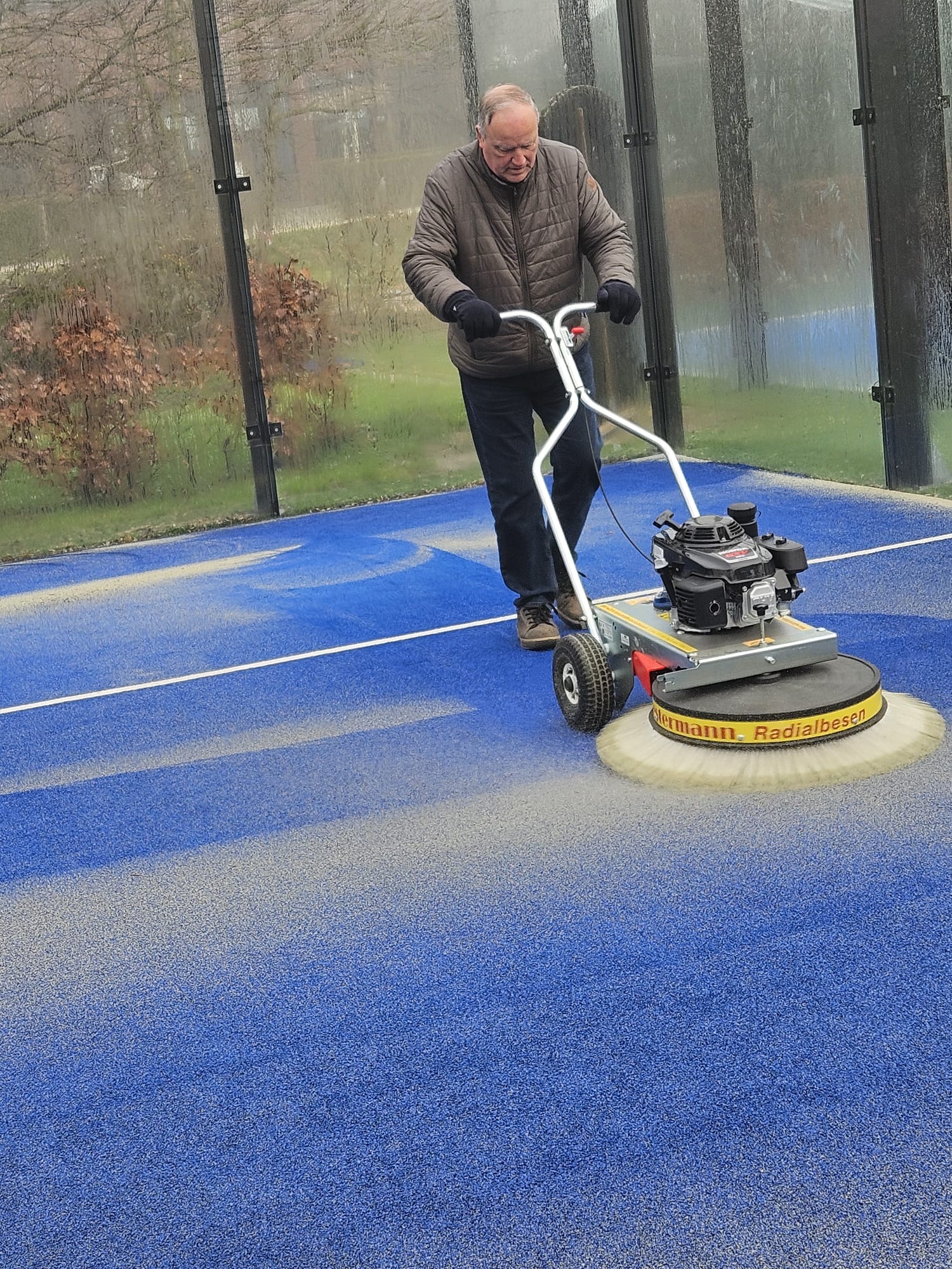 Voor de speelvelden is de machine met name geschikt om het uit elkaar gespeelde zand terug te borstelen en de kantjes alg- en mosvrij te houden. Doordat hij relatief smal is kan het apparaat makkelijk via de doorgangen op de baan komen.